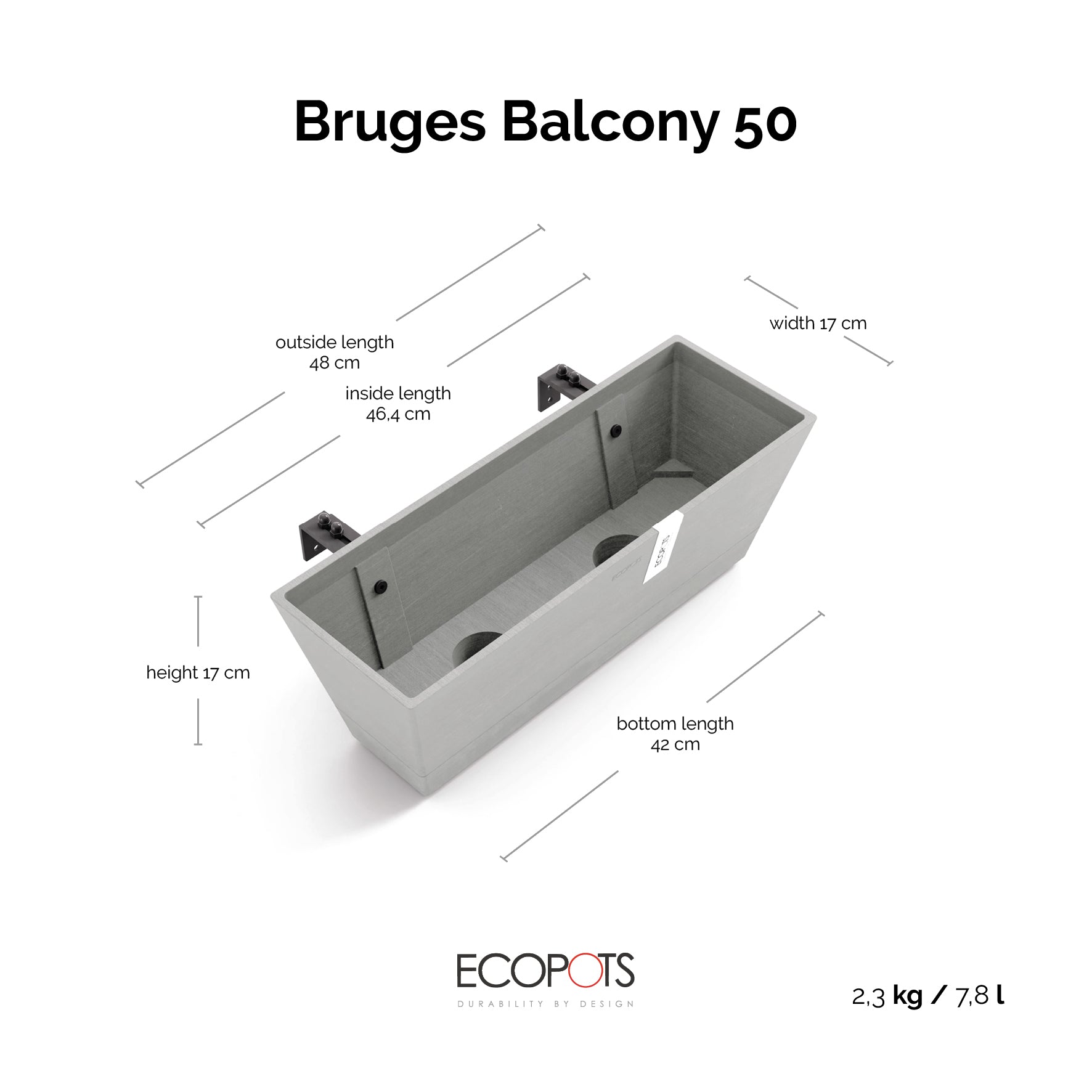 Ecopots Bruge ripustettava on moderni ja minimalistinen kaideruukku, joka tuo parvekkeellesi helppoa vihreyttä ja viimeistellyn ilmeen. Ruukun älykäs ripustusjärjestelmä sopii kaikille yleisimmille kaiteille (4–12 cm) ja säädettävä kehys varmistaa, että ruukku pysyy aina suorassa.